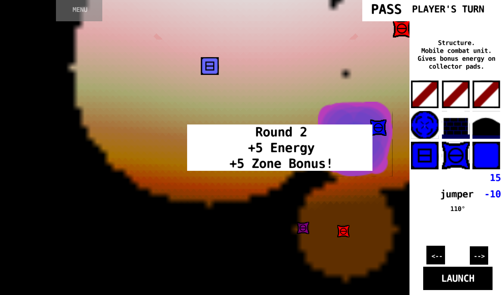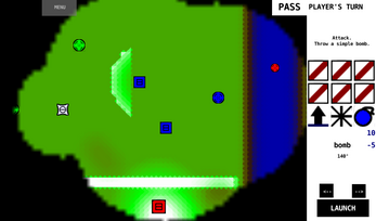 How to play: After picking a map, you can control the camera with normal WASD/arrows/mouse and you'll see a panel on the right. Each player gets unlimited turns per round. You gain energy every round which can be spent on units and actions. When it's your turn, select a blue unit to see a list of actions on the right. To create a unit or take an action, you need to aim and fire... which is the controls far bottom right. Black arrows set angle (0 is up, 90 is right, etc) then hold the LAUNCH button to charge up. Higher charge means more launching force or modifies actions in some way. Destroy all enemy controllable units (base and jumper) to win. Crossing map is free-for-all with water physics. Canyon map is 2v2 and features a bonus energy region to capture. Enjoy!